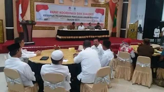 Rapat koordinasi dan evaluasi tentang pemilu serentak tahun 2019 di Auditorium Gubernuran, Rabu (20/2) itu dipimpin langsung oleh Gubernur Sumatera Barat Irwan Prayitno.
