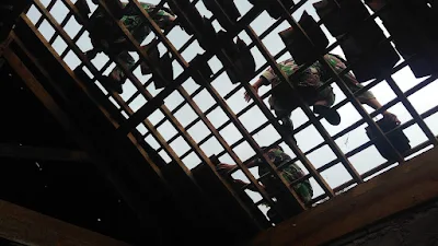 Trenggalek- Apabila disorot dari dalam rumah, nampak atap rumah Murtini warga Dusun Kalitelu, Desa Dompyong, Trenggalek berlobang. Itu disebabkan karena atap rumahnya masih belum juga dipasang genteng. Satgas TMMD kali ini sedang memasang genteng bersama warga.
